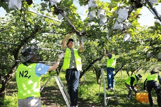 NH투자증권 임직원 20여명은 배 농가를 방문해 수확되는 시기를 놓치지 않게 작업을 지원했다. NH투자증권은 농촌 고령화 등으로 영농에 많은 어려움을 겪는 농민들을 지원하기 위해 ‘함께하는 마을’ 프로그램을 통해 임직원 농촌 일손 돕기를 진행하고 있다.