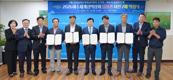 (재)2026여수세계섬박람회조직위원회(이하 조직위)는 지난 16일 여수시청 시장실에서 여수 농업인 단체와 2026여수세계섬박람회 입장권 1,500만 원 규모의 사전 구매 약정을 체결했다고 밝혔다.