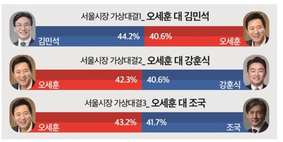 그리고 가상 양자 대결에서는 범진보 후보로 김 총리가 나설 경우, 김 총리 44.2% vs 오 시장 40.6%로 김 총리가 오차범위내에서 우세했으며, 오 시장과 조 위원장의 경우는 43.2% vs 41.7%로 오 시장이 우세했고, 강 실장과 대결할 경우는 42.3% vs 40.6%로 오 시장이 우세했다.