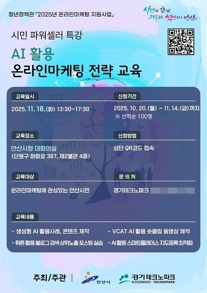 교육은 오는 11월 18일 오후 1시 30분부터 5시 30분까지 안산시청 대회의실(제2별관 4층)에서 진행된다. 온라인 마케팅에 관심 있는 시민 누구나 무료로 참여할 수 있다.