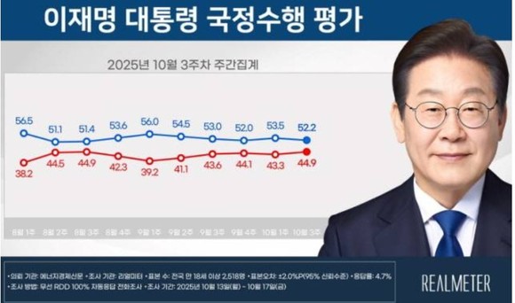 이와 관련 리얼미터 한 고위 관계자는 “주 초에는 추석 연휴가 이어지면서 한미 관세 협상 난항, 그리고 전산망 마비 중 예능 프로그램 출연 등이 맞물려 지지율이 하락세를 보였다”면서 “그러다가 주 중반에는 캄보디아 납치·감금 사태에 대한 정부 대응 지연 비판, 고강도 부동산 대책 발표 이후 확산된 전세난 우려로 50% 초반대에서 정체하는 양상이 보였다”고 분석했다.