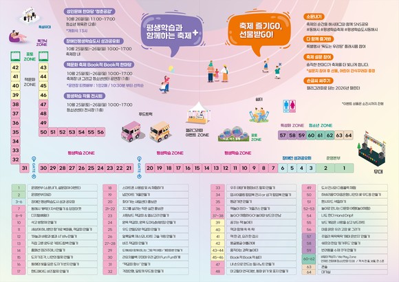 세대와 계층을 잇는 소통의 공간 조성을 위해 지역의 100여 개 평생학습관련 기관·단체·동아리, 학습자 등이 참여하여 평생학습마당·BOOK적BOOK적한마당·장애인 평생학습한마당·문해교육 한마당 등 테마별로 나누어 공연발표(40여개), 체험·홍보존(50여개) 및 전시존을 운영하며, 어린이를 위한 뮤지컬, 마술극 등 다양한 프로그램도 진행된다.