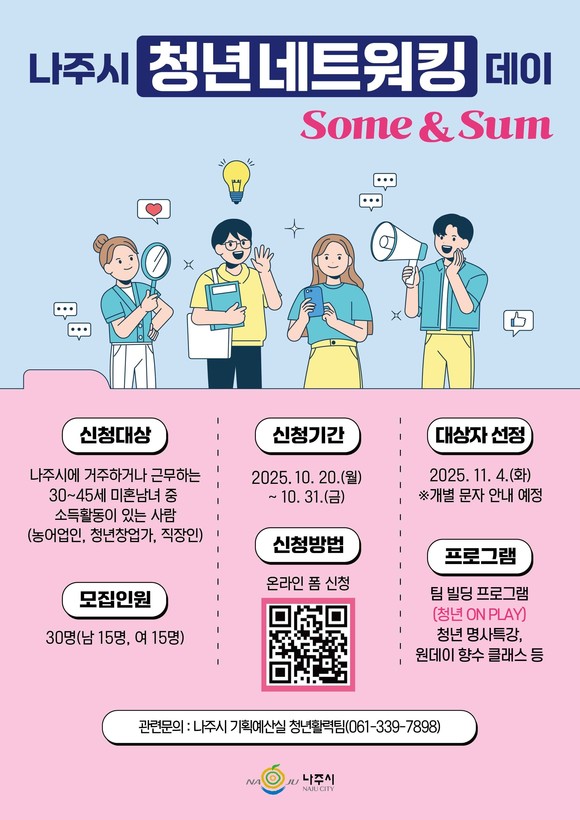 나주시(시장 윤병태)는 오는 11월 15일 나주시 일원에서 열리는 ‘청년 네트워킹 데이’ 행사를 앞두고 참가자를 모집하고 있다고 23일 밝혔다.