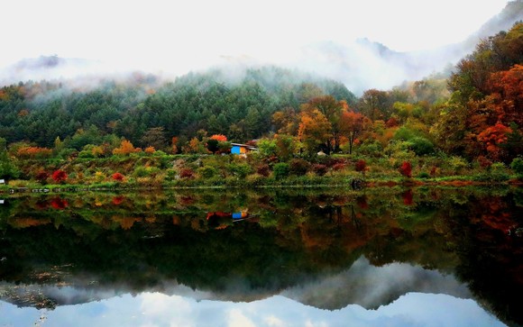 26일 인제군 기린면 방동리 방태산 자락에 가을 단풍인 절정을 이룬 가운데 호수와 어우러져 절경을 연출하고 있다.