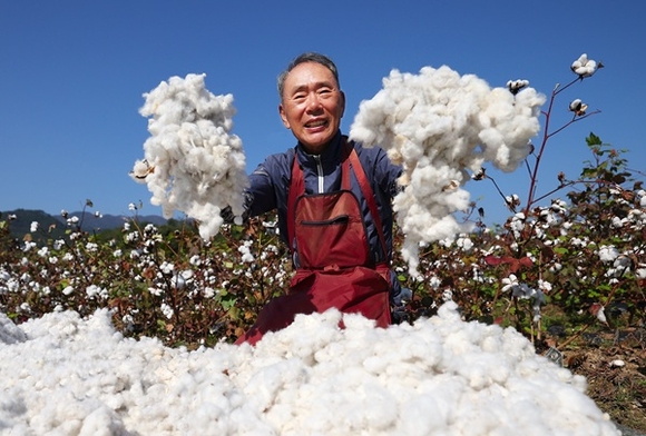 27일 경남 함양군 지곡면 개평한옥마을 목화밭에서 임채장씨가 천연 목화솜을 가을햇살에 말리며 들어보이고 있다.