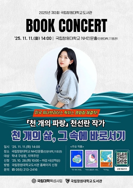 정연길 국립창원대 도서관장은 “이번 북콘서트는 천선란 작가의 SF 세계를 통해 미래와 인간, 기술과 감정의 경계를 탐구하고, 참가자들이 상상력과 사유의 폭을 넓히는 시간이 될 것”이라며 “도서관이 지역사회와 함께 다채로운 상상과 창의적 경험을 나누는 장으로서 역할을 이어가겠다”고 말했다.