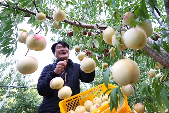 28일 경남 함양군 지곡면 시목마을 한스타 복숭아 농장에서 청년농부인 한수진씨가 직접 브랜드화한 겨울복숭아 '설도'를 첫 수확하고 있다.