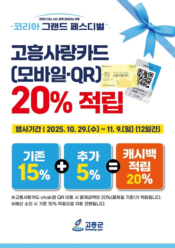고흥군은 전국적으로 진행되는 코리아 그랜드 페스티벌에 발맞춰 지역 소비 및 상권 활성화를 위해 모바일 고흥사랑상품권 적립률을 5% 상향해 총 20% 특별 적립 이벤트를 마련했다.