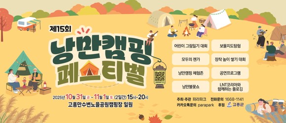 ㈜파라가 주최·주관하고, 고흥군과 (사)한국캠핑산업협회, LNT코리아가 후원하는 ‘제15회 낭만캠핑 페스티벌’이 오는 31일 오후 3시 개막을 시작으로 11월 1일 밤까지 고흥만 수변노을공원 일원에서 열린다.