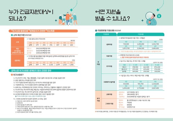 긴급복지 지원은 주 소득자의 실직, 사망, 중한 질병․부상, 화재, 휴․폐업 등 위기 상황 발생으로 생계유지가 곤란한 저소득 가구에 생계비, 의료비, 주거비, 복지시설 이용, 교육비, 해산비 등을 지원하는 제도로 거주지 관할 읍․면사무소나 입원 치료 중인 의료기관을 통해 신청할 수 있다.