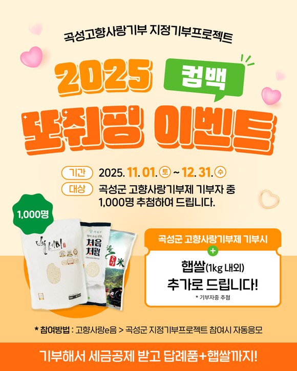 두 달 동안 10만 원 이상 기부자에 대해 매달 500명을 무작위 추첨해 1만 원 상당의 지역 쌀을 증정한다. 참여 방법은 고향사랑e음 또는 위기브 등 민간 플랫폼을 통해 곡성군에 기부하면 자동으로 응모되며, 당첨자는 개별 통보된다.