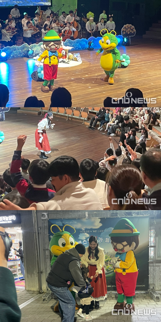 (위에서부터) 피노키오와 베짱이가 공연을 진행하고 있다, '퀴즈' 코너에서 손을 들고 있는 관람객들, 공연이 끝난 후 마련된 '포토샷' 이벤트 (사진=홍지후 기자)