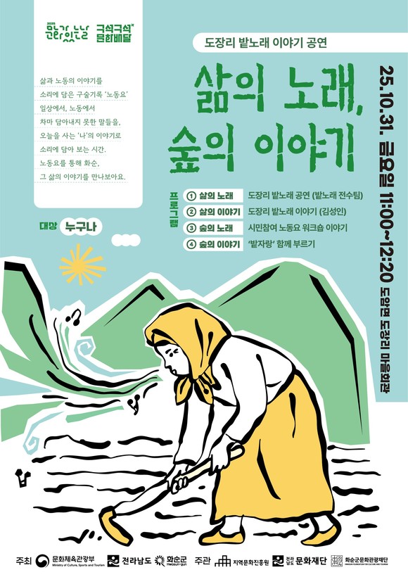 프로그램은 총 4개 파트로 구성된다. ▲도장리 밭노래 전수팀이 들려주는 ‘삶의 노래’ ▲전승자 김성인이 전하는 밭노래의 기억과 마을의 역사 ‘삶의 이야기’ ▲10월 한 달간 진행된 시민 참여 워크숍의 기록과 창작 노동요를 선보이는 ‘숲의 노래’ ▲모두가 함께 부르는 ‘발자랑’과 ‘공공다래’의 ‘숲의 이야기’다. 이번 공연은 관람 중심이 아닌 시민이 함께 부르고 공감하는 참여형 공연으로 기획됐다.
