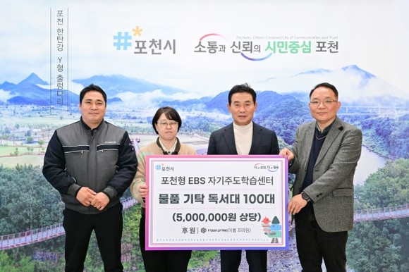 포천시에 소재한 나무제품 제조업체 ㈜이룸프라임이 4일, 포천시청 시장집무실에서 ‘포천형 한국교육방송(EBS) 자기주도학습센터’ 학생들을 위한 독서대 100개(500만 원 상당)를 기탁했다. 회사는 지역 학생들의 학습 역량 강화와 학습 환경 개선에 힘을 보태기 위해 기탁했다고 설명했다.