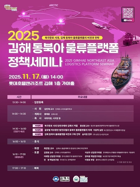 전문가 발표 세션에서 ▲영산대 홍성원 교수(북극물류연구소장)가 '북극항로 시대 당면과제와 김해시 역할'을, ▲부산항만공사 이응혁 국제물류지원실장이 '글로벌 허브 항만 발전 모델과 김해 동북아 물류플랫폼의 미래'를 발표한다. 이어 시에서 발주한 김해 동북아 물류플랫폼 타당성 검토 및 기본계획 수립 용역 책임기술자인 ▲송지현 ㈜선진 전문가 김해 동북아 물류플랫폼 비전과 구축 전략을 설명한다.