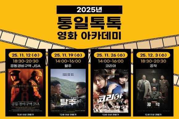 인천광역시는 오는 12일부터 12월 3일까지 매주 수요일, 인천 CGV에서‘2025년 통일톡톡(TalkTalk) 영화아카데미’를 개최한다고 밝혔다.