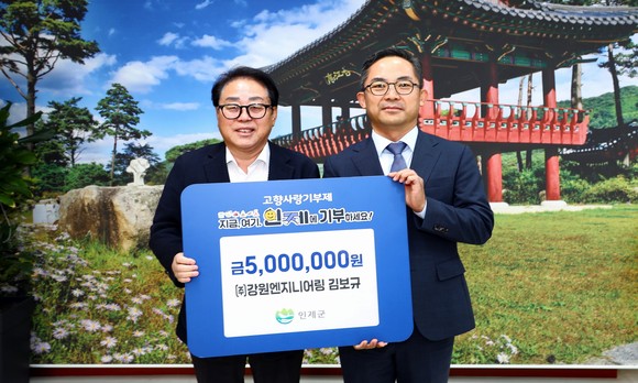 김보규 강원엔지니어링 전문가 지난 7일 인제군에 고향사랑기부금 500만원을 기탁하고 인제군의 지역 발전을 응원했다. 김 전무는 2년 연속 인제군 고향사랑을 실천하고 있다.