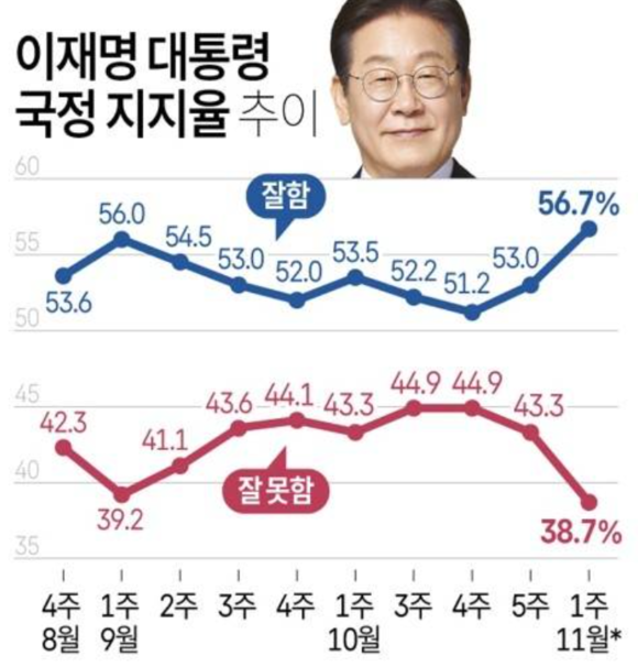 우선 리얼미터가 에너지경제신문 의뢰로 지난 3∼7일 전국 18세 이상 2528명을 상대로 조사한 결과에서 이 대통령의 국정수행을 긍정적으로 평가한 응답자는 56.7%였다. 이는 직전 주 조사보다 3.7%포인트(p) 오른 결과였고, 이로써 2주 연속 상승세를 기록했다.