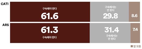또한 구속 심사를 앞둔 추경호 국민의힘 전 원내대표에 대해서도 비슷하게 열 중 여섯은 ‘구속돼야 한다’고 응답했다.