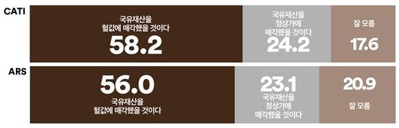 현재 문제가 되고 있는 직전 윤석열 정부에서의 국유재산 매각에 대해서도 열 중 여섯 정도는 ‘헐값에 매각했을 것’이란 시각을 갖고 있는 것으로 밝혀졌다.