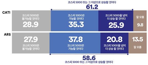 증시에 대해서도 비슷하게 열 중 여섯 명 정도가 ‘이재명 정부 임기 내 코스피 5000을 돌파하고 그 이상도 가능할 것’이라는 낙관적 전망을 하고 있는 것으로 확인됐다.