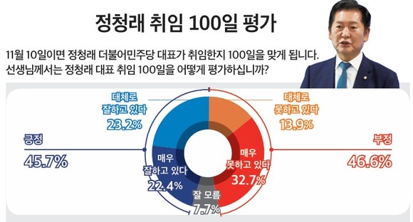 여론조사 전문기관 <미디어토마토>가 <뉴스토마토>의 의뢰로 지난 3일부터 4일까지 이틀 동안 만 18세 이상 전국 성인남녀 유권자 1031명을 대상으로 ‘민주당 정청래 대표의 취임 100일을 어떻게 평가하는가?’라는 질문에 ‘잘했다’는 긍정적인 답변은 45.7%(‘매우 잘했다’ 22.4%, ‘대체로 잘했다’ 23.2%), 반면, ‘못했다’는 부정적인 답변은 46.6%(‘매우 못했다’ 32.7%, ‘대체로 못했다’ 13.9%), ‘잘 모르겠다’며 답변을 유보한 층은 7.7%로 나타났다.