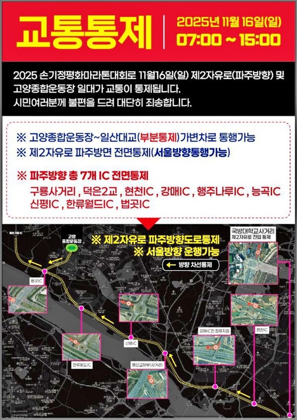 이에 따라, 대회 당일인 오는 16일 오전 7시부터 오후 3시까지 제2자유로 파주방면 구룡사거리~법곳IC 구간의 모든 IC 진입이 통제된다. 고양시는 운전자들에게 해당 시간대 우회도로 이용을 권고했다.