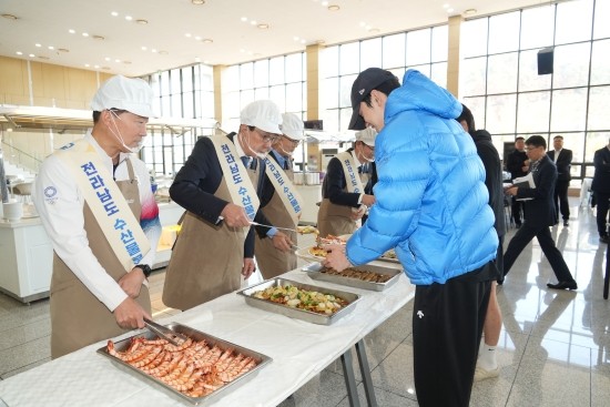 이날 전라남도의 지원을 받아 국가대표 선수 등 550여명을 대상으로 전가복, 굴국, 문어, 새우숙회, 민어전, 민물장어구이, 참조기구이 등 전남 대표 수산물로 구성된 점심 특선을 선보였다. 노동진 수협중앙회장은 수산물 특식을 직접 배식하며 훈련에 매진하는 선수들을 격려했다.