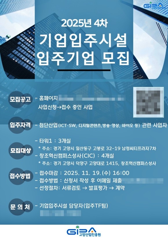 고양산업진흥원은 오는 19일까지 기업입주시설 신규 입주기업을 모집한다. 모집 규모는 타워1의 3개실과 창조혁신캠퍼스 성사의 4개실로 총 7개실이다.