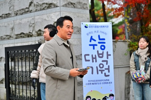 백영현 포천시장이 수능 시험장 앞에서 수험생들에게 응원물품을 나눠주며 격려 인사를 전하고 있다. 시험장 입구에는 시 관계자들도 함께 배치돼 수험생들을 맞이했고 현장에는 따뜻한 응원 분위기가 이어졌다.