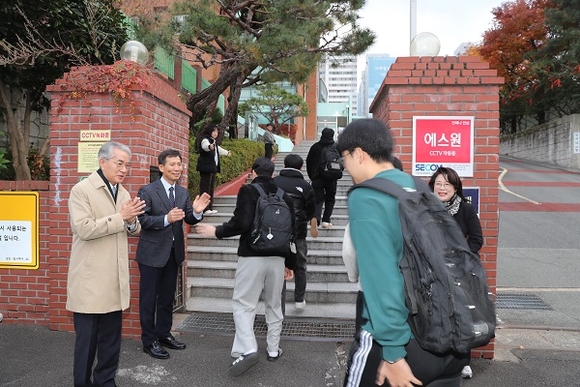 박종훈 경남도교육감이 2026학년도 대학수학능력시험 당일인 13일 오전 창원사파고등학교를 방문해 수험생들을 격려하고 있다.
