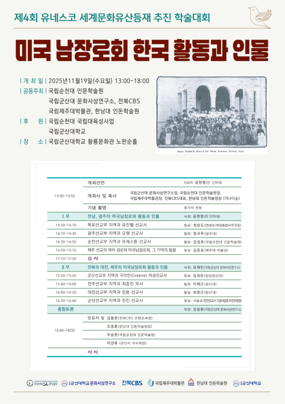 국립순천대학교(총장 이병운) 인문학술원 종교역사문화센터는 오는 11월 19일 국립군산대학교 황룡문화관 1층 노판순홀에서 ‘미국 남장로회 한국 활동과 인물’을 주제로 제4회 유네스코 세계문화유산 등재 추진을 위한 학술대회를 개최한다고 밝혔다.