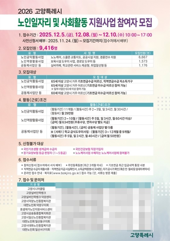 고양특례시가 오는 2026년 노인일자리와 사회활동지원 사업에 382억 원을 투입하고 참여자 9400여 명을 통합 모집한다.