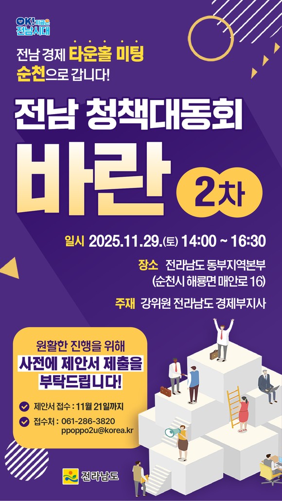 전라남도는 29일 동부지역본부에서 경제 타운홀 미팅인 ‘전남 청책대동회 바란(2차)’을 개최키로 하고 21일까지 정책 제안서를 받는다고 밝혔다.