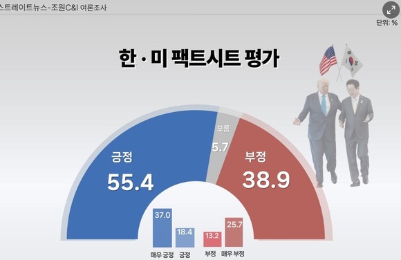 여론조사 전문기관 <조원씨앤아이(조원C%I)>가 <스트레이트뉴스>의 의뢰로 지난 15일부터 17일까지 사흘 동안 전국 만 18세 이상 남녀 유권자 2003명을 대상으로 ‘한미 정상회담 당시 공동 발표한 팩트시트 내용이 경제· 안보에 어떤 영향을 미칠 것으로 보는가?’라는 질문에 ‘긍정적인 영향이 미칠 것’라는 답변이 55.4%(’매우 긍정적‘ 37.0%. ’약간 긍정적‘ 18.4%)로 나타난 반면, ’부정적인 영향이 미칠 것’이라는 답변은 38.9%(‘약간 부정적’ 13.2% ‘매우 부정 적’ 25.7%), ‘잘 모르겠다’는 5.7%로 집계됐다.