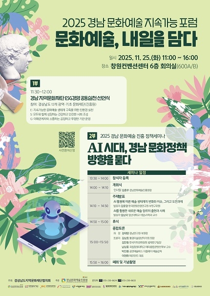 ‘문화예술, 내일을 담다’라는 슬로건 아래 열리는 이번 포럼은 경남도 지역문화재단 협의회(경남문화예술진흥원 및 도내 11개 기초문화재단)가 주최하고 진흥원이 주관한다. 행사는 도내 문화예술 기관들이 연대해 지속가능한 경영(ESG) 실천 의지를 다지는 1부 선언식과, 급변하는 인공지능(AI) 시대의 미래 정책 방향을 논의하는 2부 정책 세미나로 구성된다.