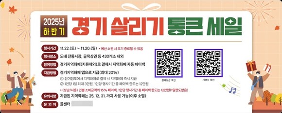 이번 ‘경기 살리기 통큰 세일’은 물가 상승과 경기 침체로 어려움을 겪는 지역 상권에 활력을 불어넣기 위한 소비 촉진 행사로, 경기도 전역에서 동시다발적으로 추진되는 대규모 소비 지원 사업이다.
