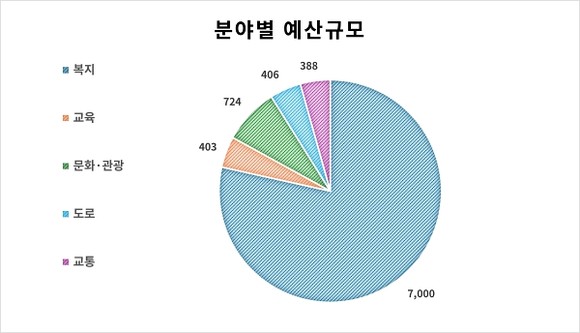 교육 분야는 403억 원 규모다. 학교급식경비지원 205억 원, 학교 교육경비 지원 50억 원, 친환경 등 우수농산물 학교급식지원 32억 원, 학교 교육프로그램 교육경비 지원 21억 원 등이 포함됐다. 교육발전특구 선도지역으로 추진 중인 34개 사업에도 30억 원을 반영했다.