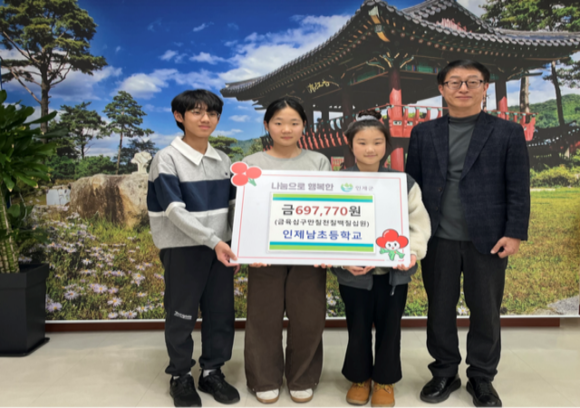 인제남초교 학생(전교회장 이재이, 전교부회장 김우진·박솔아)들이 지난 21일 인제군청을 방문해 지역의 어려운 이웃을 위해 써 달라며 69만7770원을 기탁했다. 성금은 학생들이 직접 알뜰시장을 열어 얻은 수익금으로 마련했다.