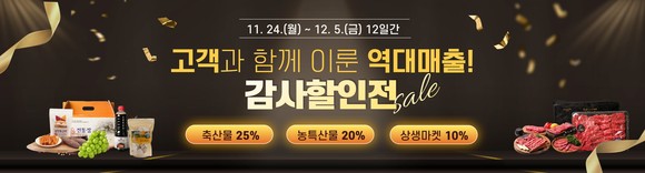 화순군(군수 구복규)은 올해 화순팜 온라인 쇼핑몰 창설 이래 역대 최고 매출 달성에 보답하고자, 이달 24일부터 다음 달 5일까지 12일간「고객과 함께 이룬 역대 매출! 감사 할인전」 이벤트를 추진한다고 밝혔다.