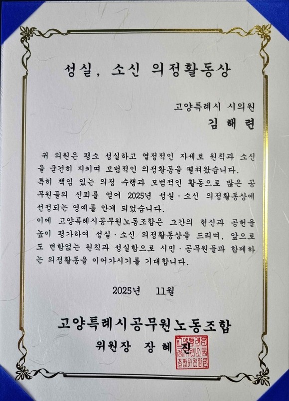 2025년도 베스트 시의원상은 지난 21일 발표됐으며, 고양시 소속 공무원을 대상으로 실시한 온라인 설문 결과를 반영해 결정됐다.