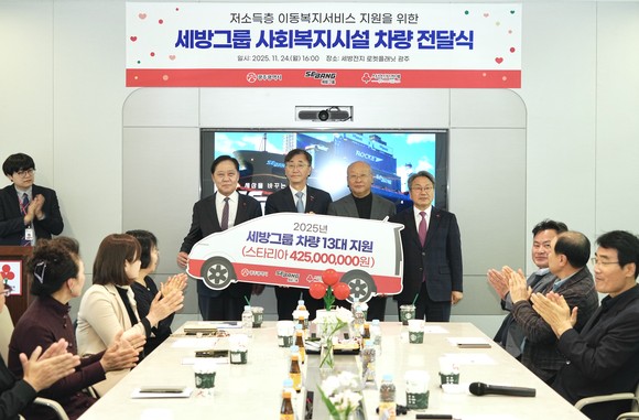 전달식은 세방그룹이 지난 1월 광주사회복지공동모금회에 기탁한 5억원의 성금을 바탕으로 마련했다. 기부금은 사회복지시설 등 13개 기관에 현대차 ‘스타리아’ 차량 13대를 지원하는데 활용된다. 또 지역복지관 프로그램 운영, 취약계층 지원 등 다양한 복지사업에도 폭넓게 쓰일 예정이다.
