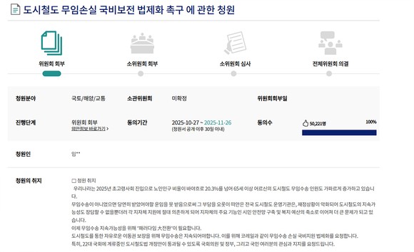 이번 청원은 초고령사회 진입에 따른 무임수송 인원 증가로 도시철도 운영기관들의 재정적 부담이 한계에 이르고 있다는 점을 국민에게 알리고, 지속 가능한 대중교통 체계를 위한 국비 지원 필요성을 제기하기 위해 마련됐다.