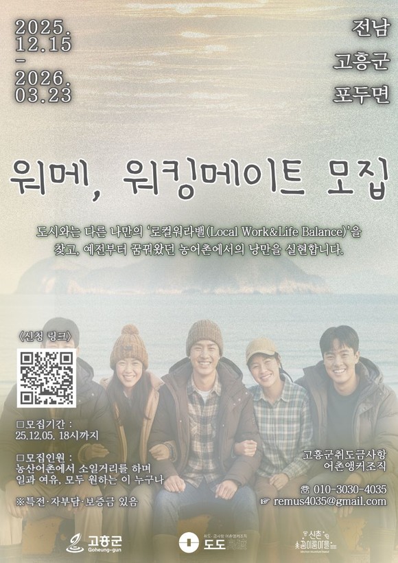 참여자 모집은 12월 5일까지, 고흥군 취도·금사항 어촌앵커조직 홈페이지(지역자산화 협동조합-커뮤니티-공지)를 통해 이루어지며, 모집인원은 3명이다. 운영 기간은 12월 15일부터 2026년 3월 23일까지 총 100일이며, 지역 고유문화와 농·축·수산업에 열린 마음가짐을 가진 누구나 신청할 수 있다.