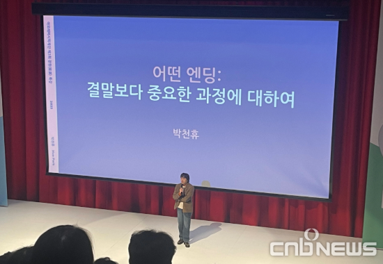 지난달 26일 아모레퍼시픽재단이 서울 용산구 본사에서 개최한 ‘제3회 장원특강’에서 연사로 나선 박천휴 작가. 뮤지컬 '어쩌면 해피엔딩'으로 토니상을 휩쓴 박 작가는 ‘어떤 엔딩: 결말보다 중요한 과정에 대하여’라는 주제로 강연을 진행했다. (사진=홍지후 기자)