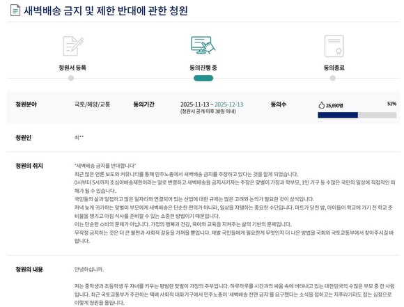 이번 청원을 주도한 자신을 ‘워킹맘’이라고 소개한 청원인은 국회전자청원 게시판에 올린 글에서 “저는 중학생과 초등학생 두 자녀를 키우는 평범한 맞벌이 가정 주부”라며 “늦은 밤에 준비물이나 생필품을 살 수 있는 건 새벽배송 덕분으로, 이미 국민 생활과 밀접한 서비스다. 국회와 정부가 특정 단체의 주장만 듣지 말고 현실적인 대안을 찾아야 한다”고 밝혔다.