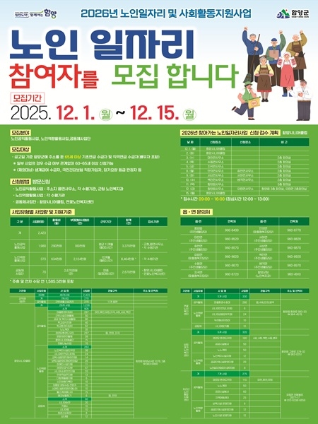 경남 함양군이 어르신들의 안정적인 소득 보전과 사회참여활동을 확대하기 위해 오는 15일까지 '2026년 노인일자리 및 사회활동지원사업' 참여자를 모집한다.
