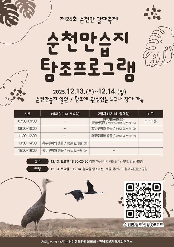 특히 겨울의 순천만에는 현재 흑두루미 약 8,600마리를 비롯해 멸종위기종인 독수리, 노랑부리저어새 등 희귀 철새가 대거 도래하고 있어, 이번 축제는 국내 최대 규모의 겨울철새 서식지를 현장에서 체험할 수 있는 특별한 기회가 될 전망이다.