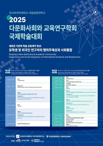 부산외국어대학교 이주다문화연구소는 국립창원대학교 다문화진흥센터와 5일부터 양일간 ‘새로운 다문화 학술공동체의 형성: 유학생 및 외국인 연구자의 행위주체성과 사회통합’을 주제로 2025 다문화사회와 교육연구학회 국제학술대회를 개최한다고 밝혔다.