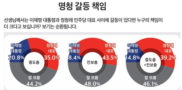 더불어민주당 정청래 대표 체제가 들어선 후 주식 양도소득세 대주주 기준과 검찰개혁 후속 조치 등을 놓고 당정 간 이견이 드러난 것을 시작으로 현직 대통령의 형사 재판을 중지하는 이른바 ‘재판중지법’ 추진을 공식화한 지 하루 만에 대통령실이 직접 제동을 거는 등 계속해서 당정간의 엇박자를 보이고 있는 것에 빗대 이른바 이재명 대통령과 정 대표와의 갈등 양상을 일컫는 ‘명청 갈등’의 존재 여부에 대해 여권의 핵심 지지기반인 진보층과 중도층의 절반가량은 ‘갈등이 없다’고 부정적으로 답변했다는 여론조사가 나왔다.